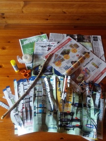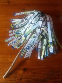 Leikkaa lehtiarkit hapsuiksi (hapsun leveys noin 1,5 cm). Älä leikkaa ylös asti, vaan jätä reunaan noin 3 cm:n kaistale. Levitä liimaa kaistaleelle ja pyöritä kiinni oksaan. Jatka kunnes huiska on riittävän tuuhea. Voit käyttää välillä teippiä apuna kiinnityksessä oksaan etenkin lopussa.